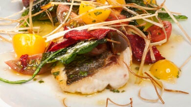 Emplata la dorada y mójala con la vinagreta de tomate. Espolvorea por encima unos cristales de sal maldon y acompaña con las verduras crujientes.