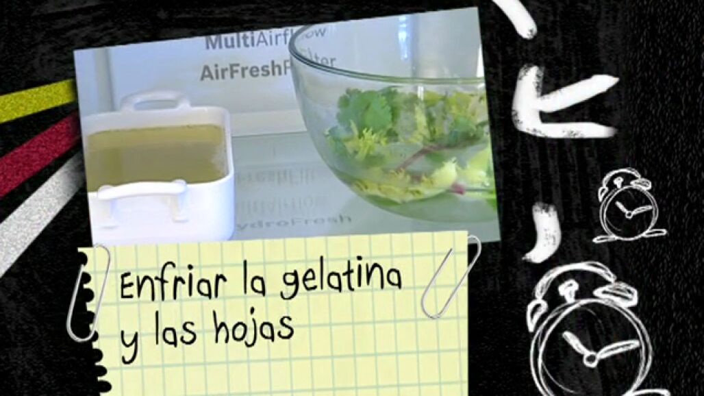 Para las hojas refrigeradas, pon unas hojas de verbena limonera, menta, remolacha, cilantro y escarola en un bol con agua fría y hielo. Introduce en el frigorífico y deja enfriar durante 1 hora, hasta que queden tersas y crocantes.