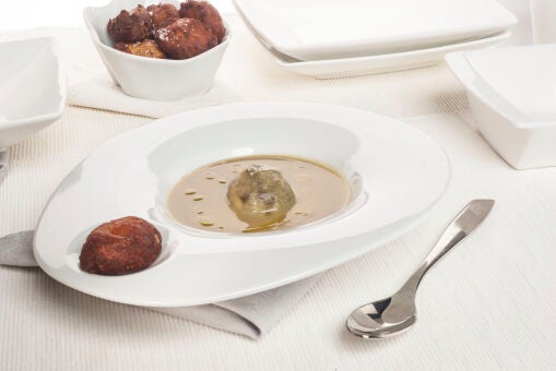 Sirve la alcachofa en un plato, cubre con la crema y acompaña con los buñuelos. Termina el emplatado con un poco de aceite de oliva virgen extra y sal.