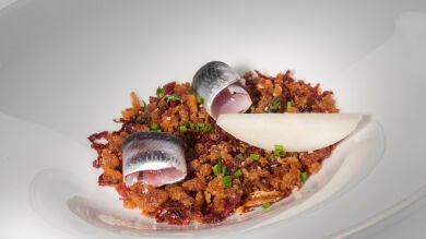 Ingredientes (2 p.): 4 sardinas, 100 g de pan del día anterior, 7 dientes de ajo, 25 g de panceta, 25 g de chorizo, 1 remolacha (cocida),2 rodajas de queso Idiazabal, agua, aceite de oliva virgen extra, aceite de oliva suave, romero, tomillo, cebollino